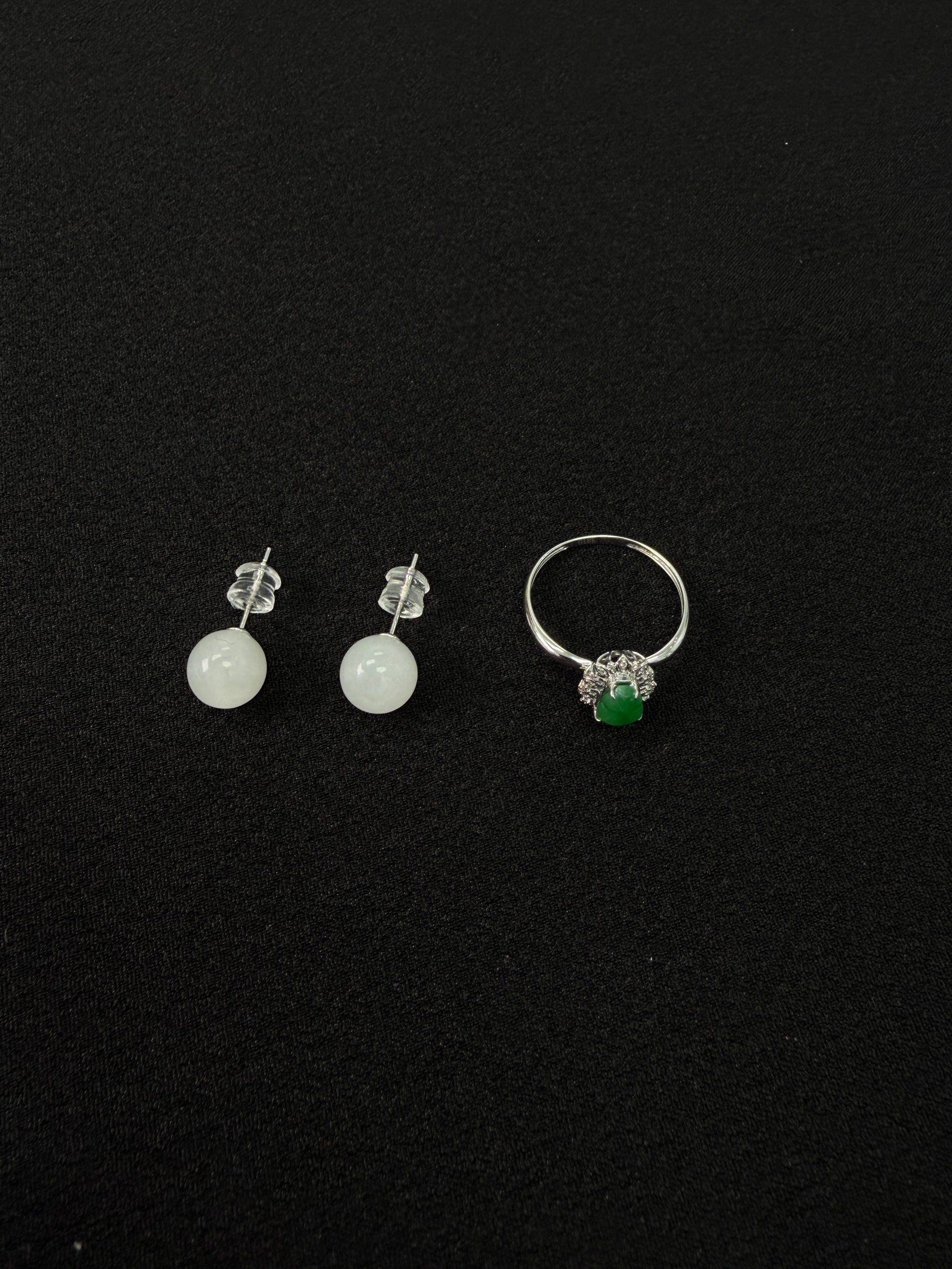 Complementing the ring, the Hetian jade stud earrings feature smooth, softly rounded beads in a gentle white tone. Set on silver posts, they offer a clean and understated look that balances the brilliance of the ring, making the set versatile and easy to wear.